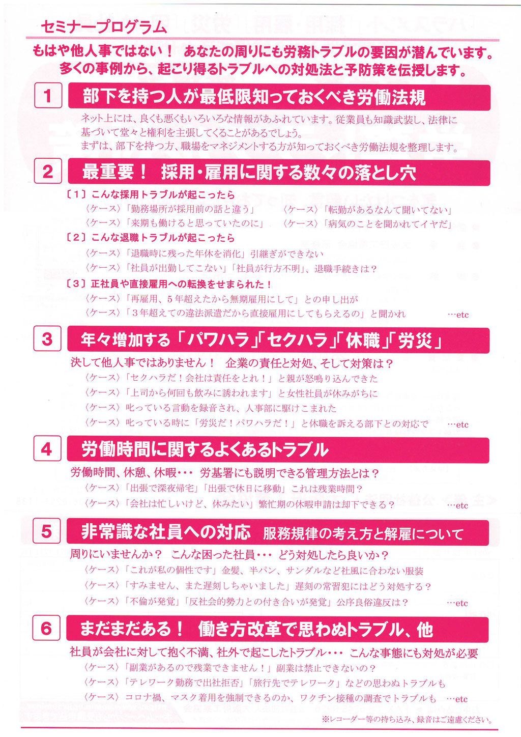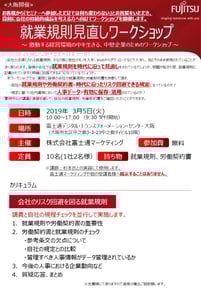 問題が起こった時に、指導や叱る根拠が「どこに書いてあるのか」と、もめるケースが多くあります。根拠を答えられる就業規則になっているでしょうか?なぜ、自社の条文の書き方ではいけないのかを理解していただきながら見直しの研修も行っています。基本的に現地指導で行います。指導当日に提示頂いてもOKです。